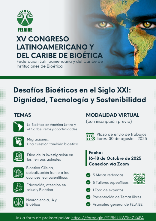 En nombre del Comité Organizador del XV Congreso de Bioética FELAIBE (Federación Latinoamericana y del Caribe de Bioética), nos es gratos invitarlos para participar en este evento académico a desarrollarse en modalidad virtual del 16 al 18 de octubre de 2025. El enlace para la inscripción, que es gratuita, y otros detalles, se hallan en nuestra página web www.felaibe.org